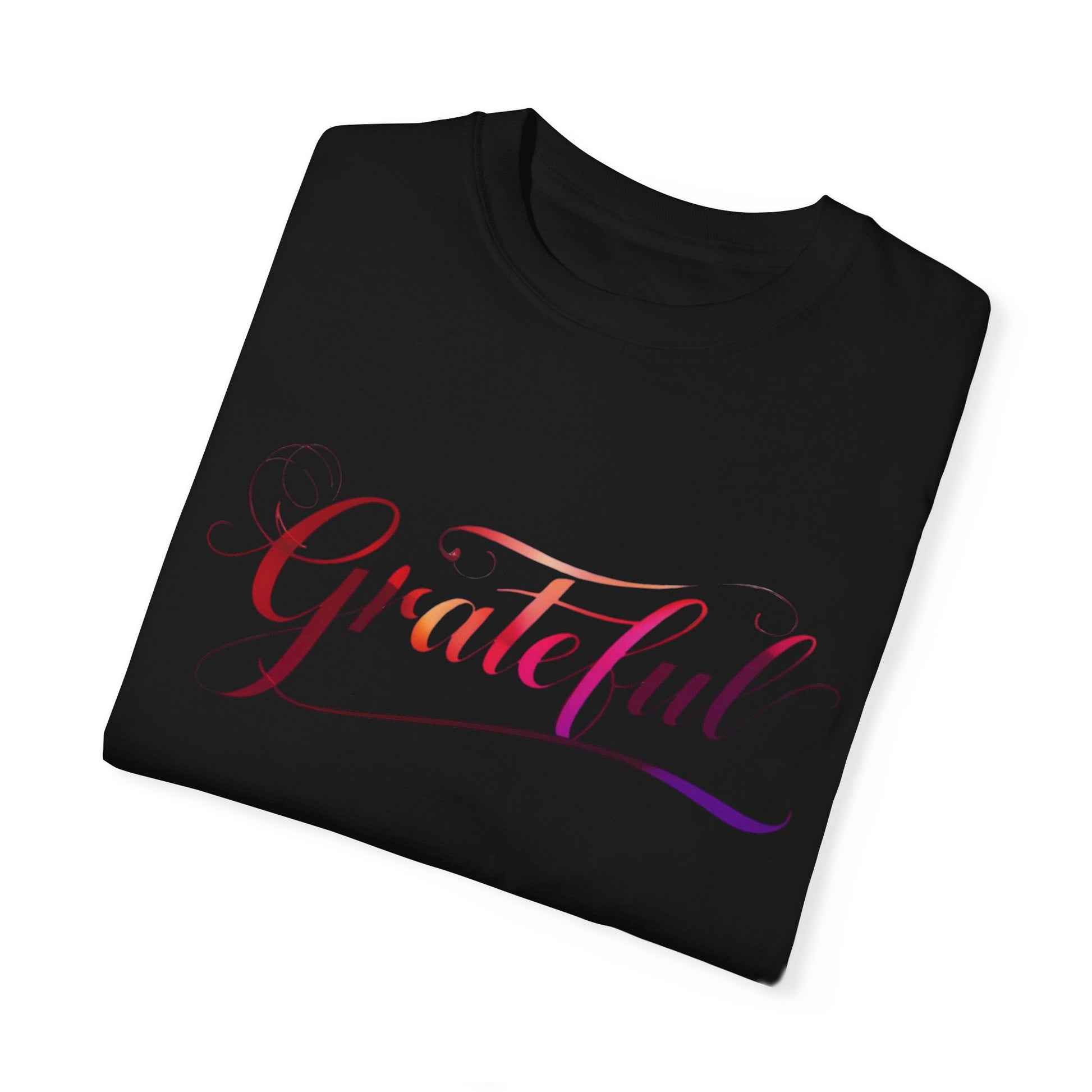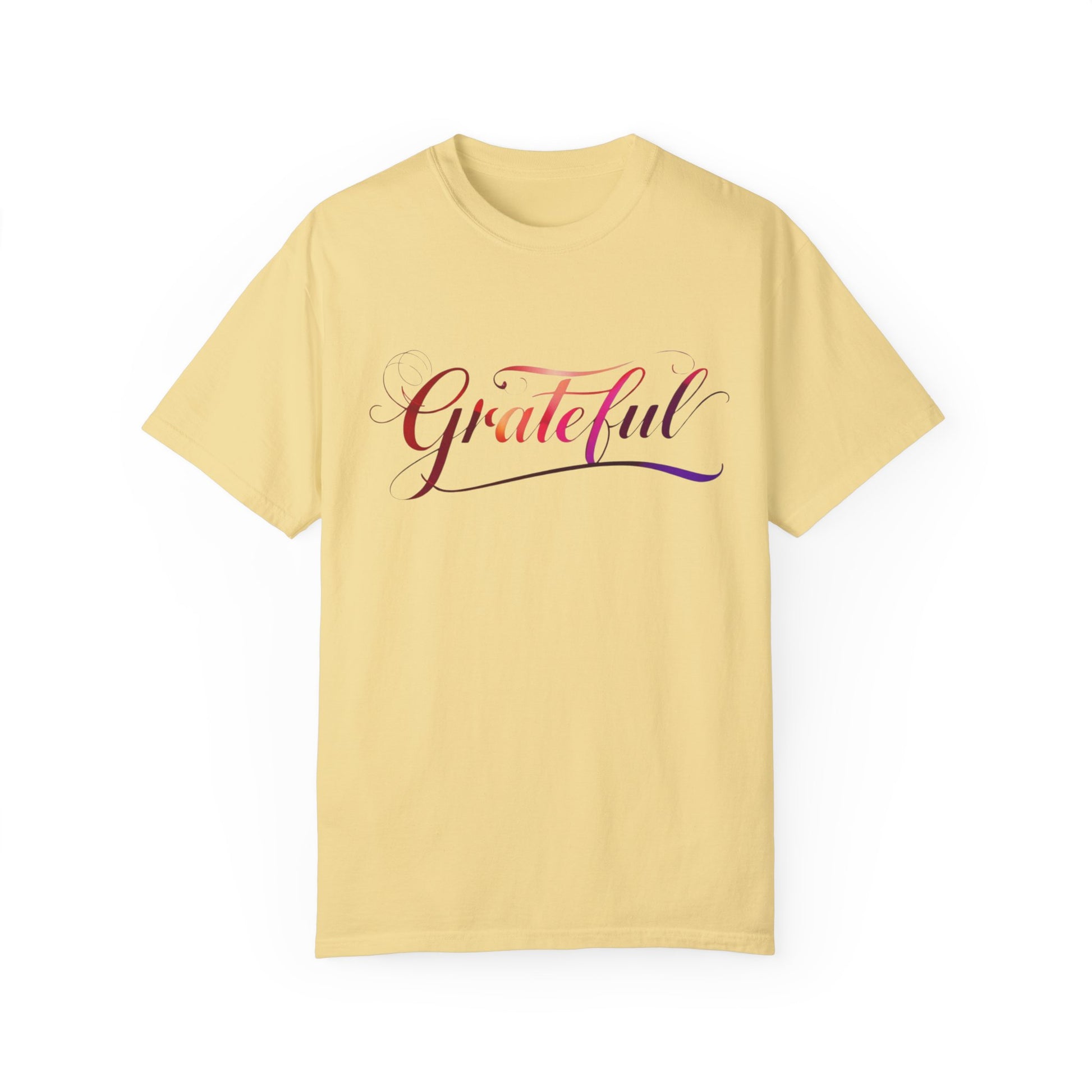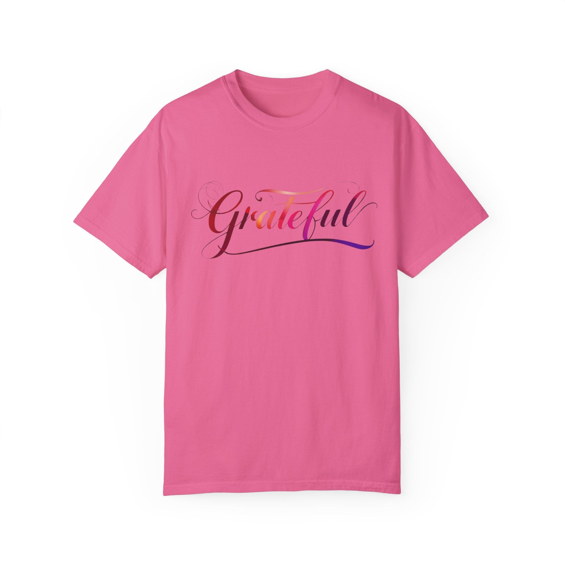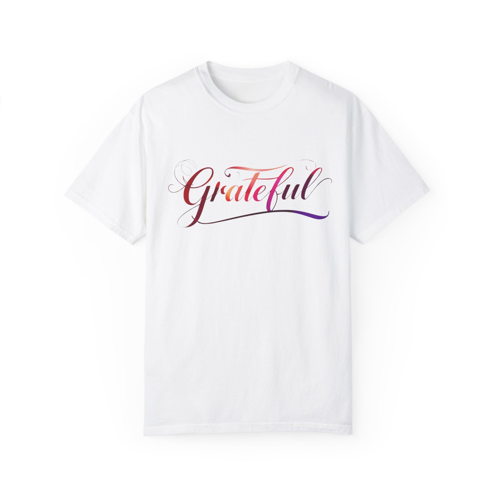 A vibrant ombre rainbow colored t-shirt that exudes gratitude. Perfect for those who want to spread positivity and joy in their everyday life. Ideal for adults looking for a comfortable and stylish tee to wear on casual outings or semi-formal events.