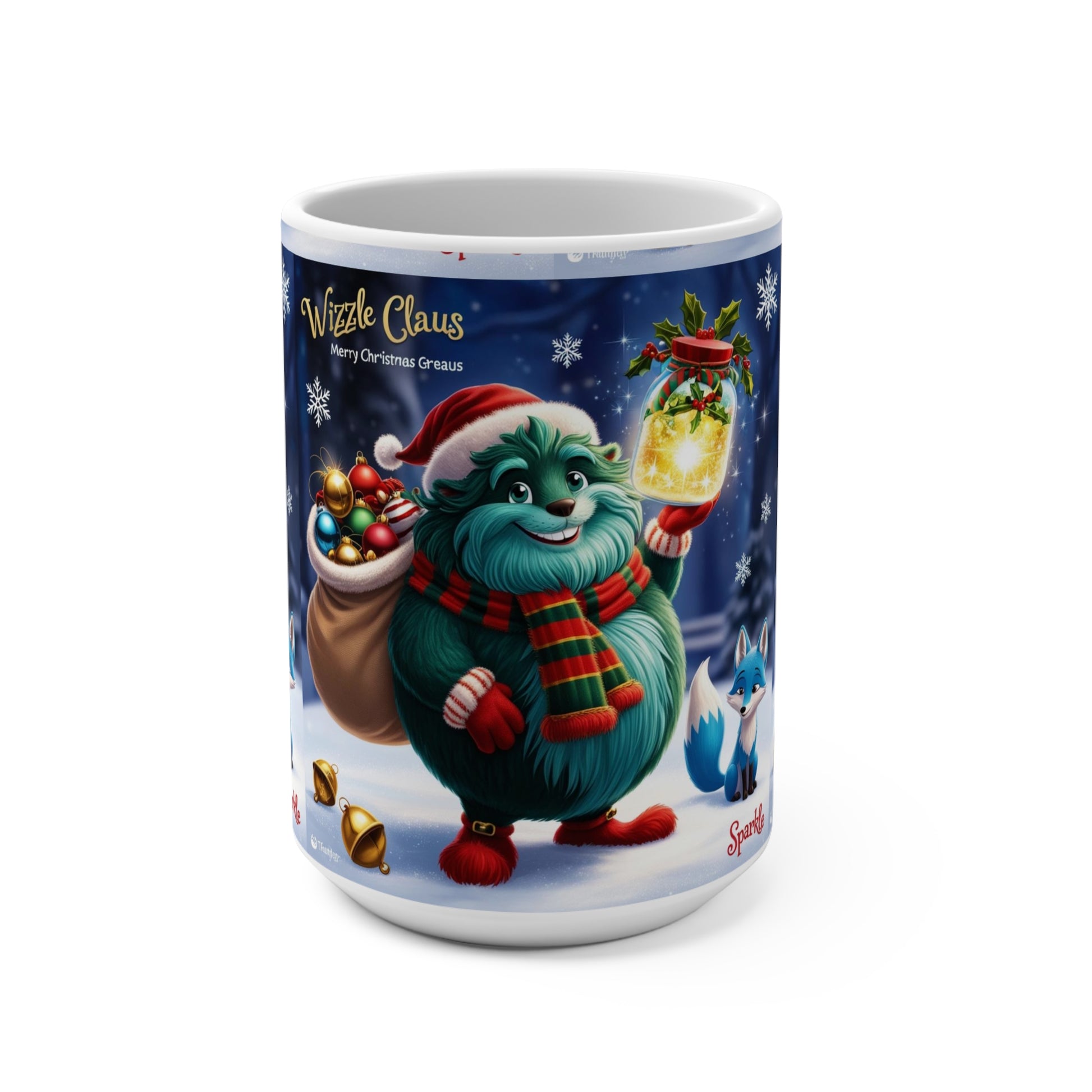 A festive 15oz ceramic mug featuring Wizzle Claus, a magical creature spreading holiday cheer. Microwave and dishwasher safe, with rounded corners and a C-handle. Perfect for enjoying hot drinks during the winter season.